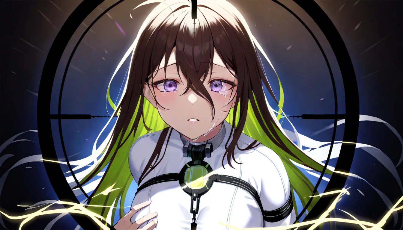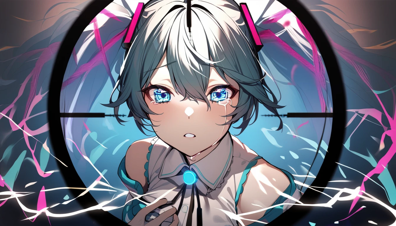 hibana, crosshair, crying with eyes open, parted lips, electricity