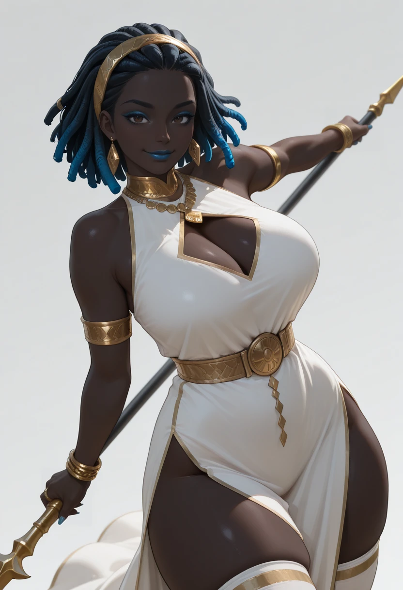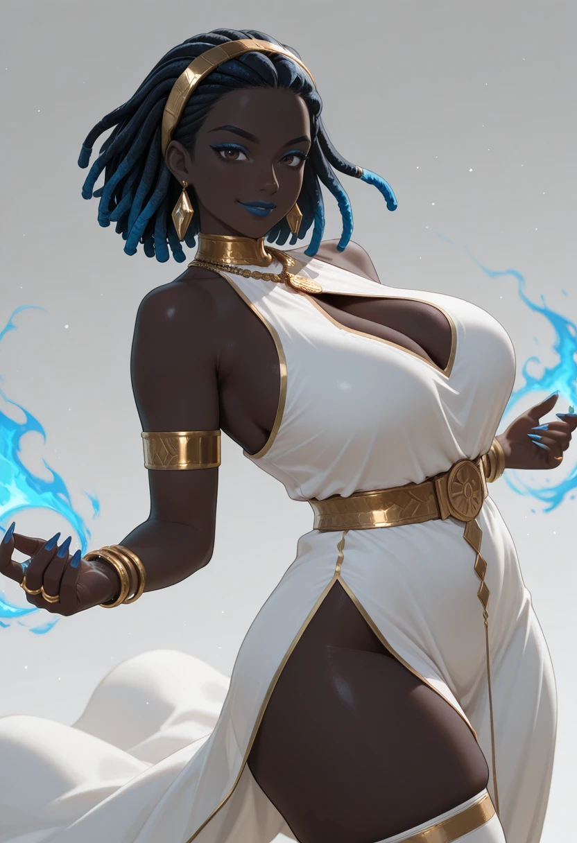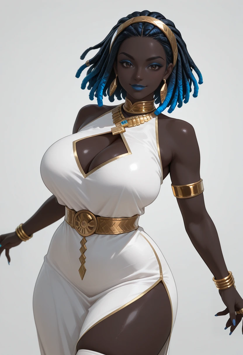 Ameyra - Black Skin, Black hair color, blue highlights, Short length, Dreadlocks, Dreadlock Bangs, Bob style, Dark Brown eyes, Full Lips, blue eyeshadow, blue lipstick, Curvy body, Large breasts, saggy breasts, thick thighs, long fingernails, blue nails,