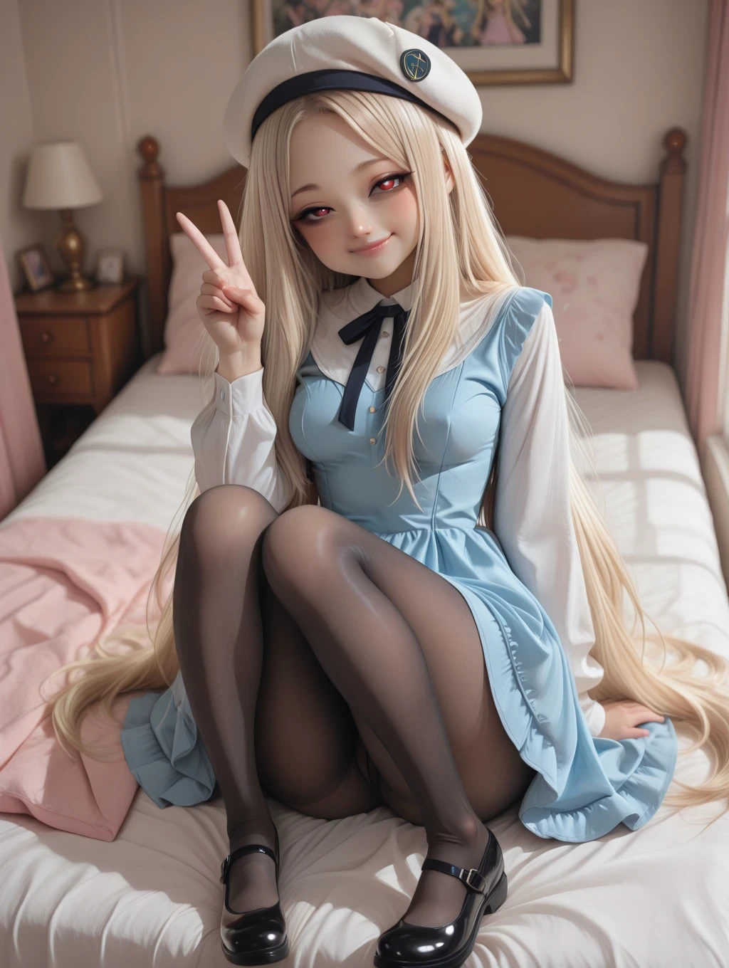 Morino korisu, long hair, blonde hair, red eyes, very long hair, bright pupils,shirt, ,long sleeves, hat, dress, white shirt, pantyhose, blue dress, beret, white headwear, mary janes,shoes ,red footwear,