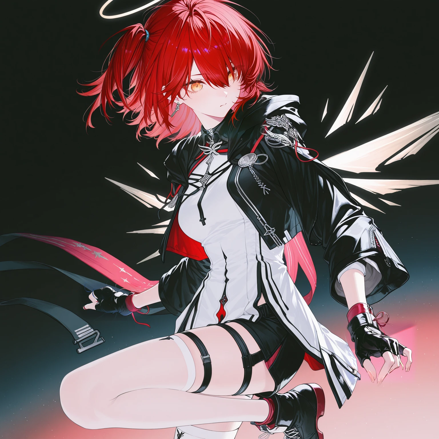 Costume:black jacket,cropped jacket,long sleeves,white dress,fingerless gloves,black gloves,black shorts,white thighhighs,multiple thigh straps,black boots,ankle boots,