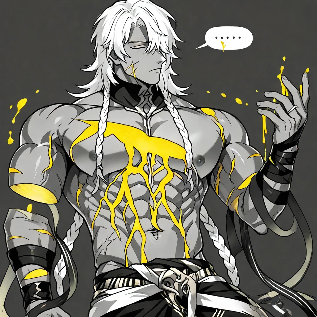 Nanook,yellow blood dripping from scar on chest,Yellow eyes,white hair,braid,bridal gauntletsdark-skinned male,dark skin,detached collar,facial scar,sidelocks,facial scar,frown,glint,hair between eyes,multiple braids,parted bangs,scar,scar on cheek,scar on face,