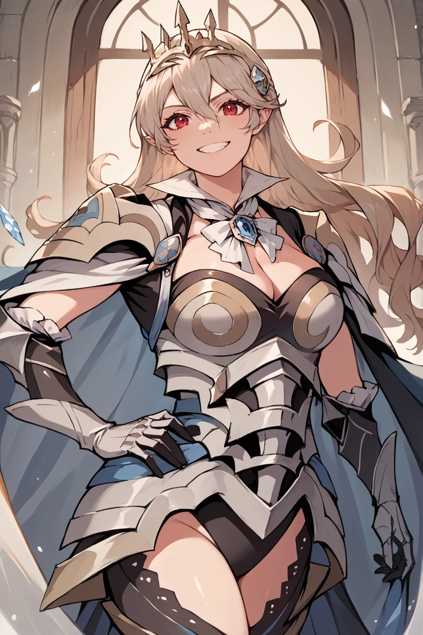 Add "defCor, black hairband, armored dress, blue cape, puffy sleeves, juliet sleeves, vambraces, black gloves, armored legwear, barefoot" for her standard appearance.