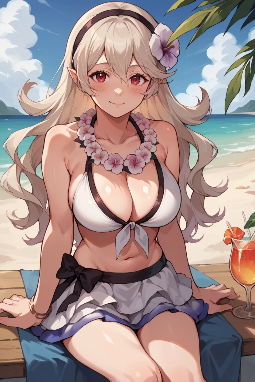 Add "sumCor, black hairband, hair flower, flower necklace, bracelet, white bikini, bikini skirt" for Summer Corrin.