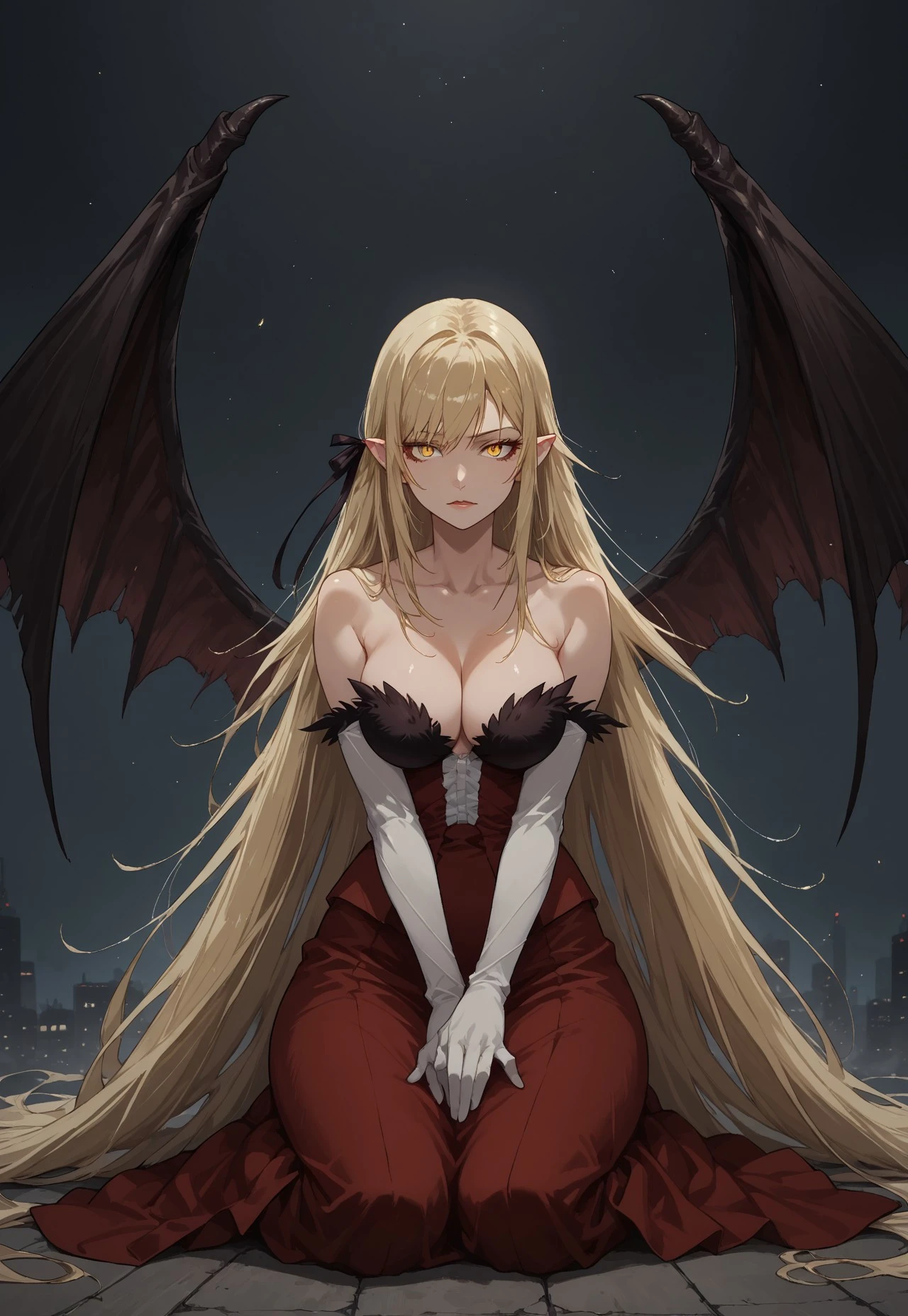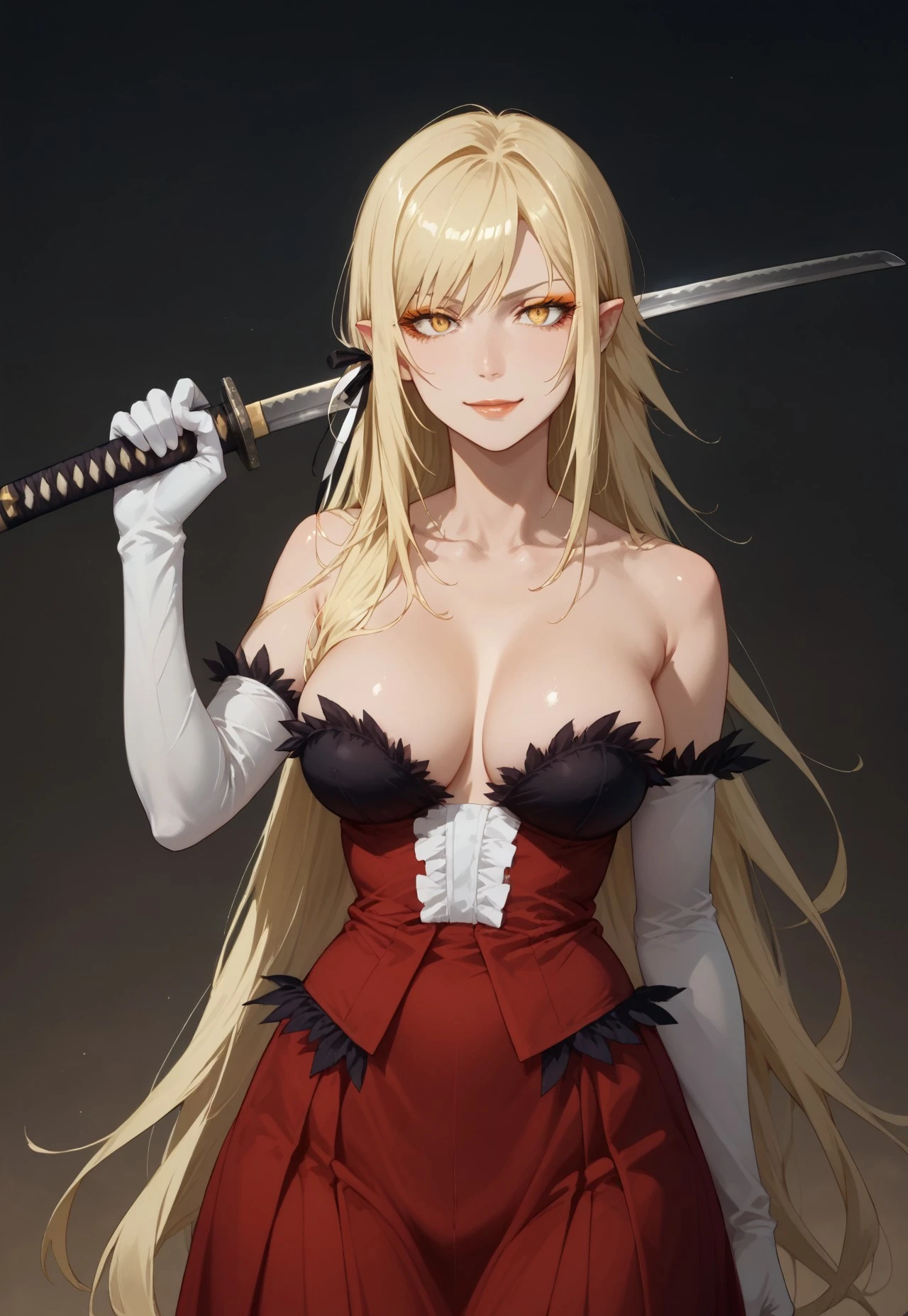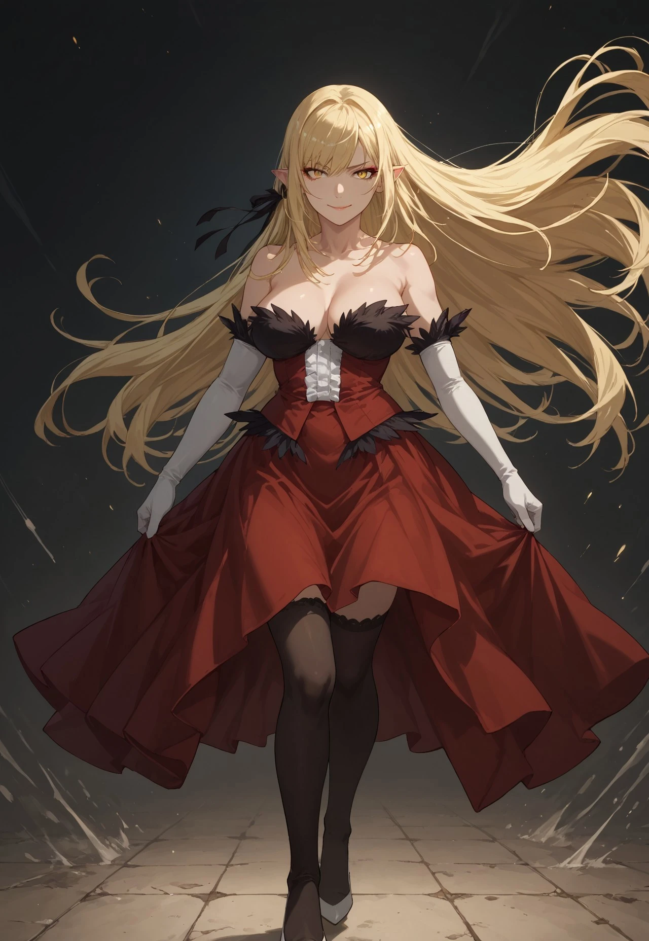 1girl, solo, blonde hair, very long hair, black ribbon, hair ribbon, pointy ears, yellow eyes, slit pupils, orange eyeshadow, large breasts, long red dress, white gloves, elbow gloves, black thighhighs, high heels, white footwear