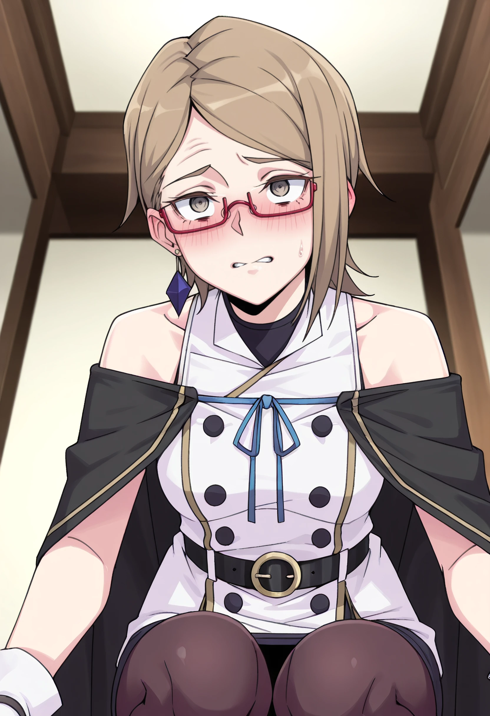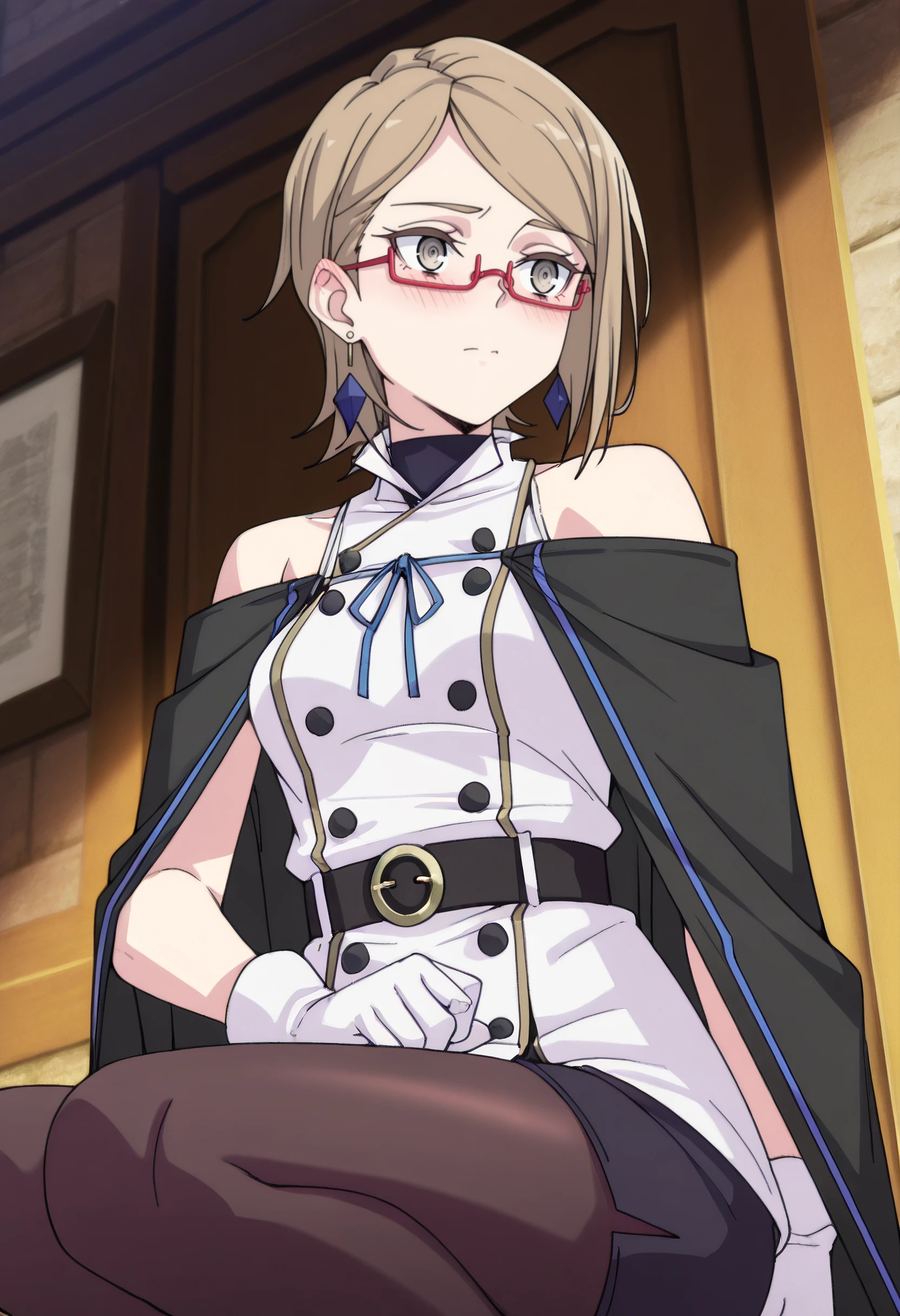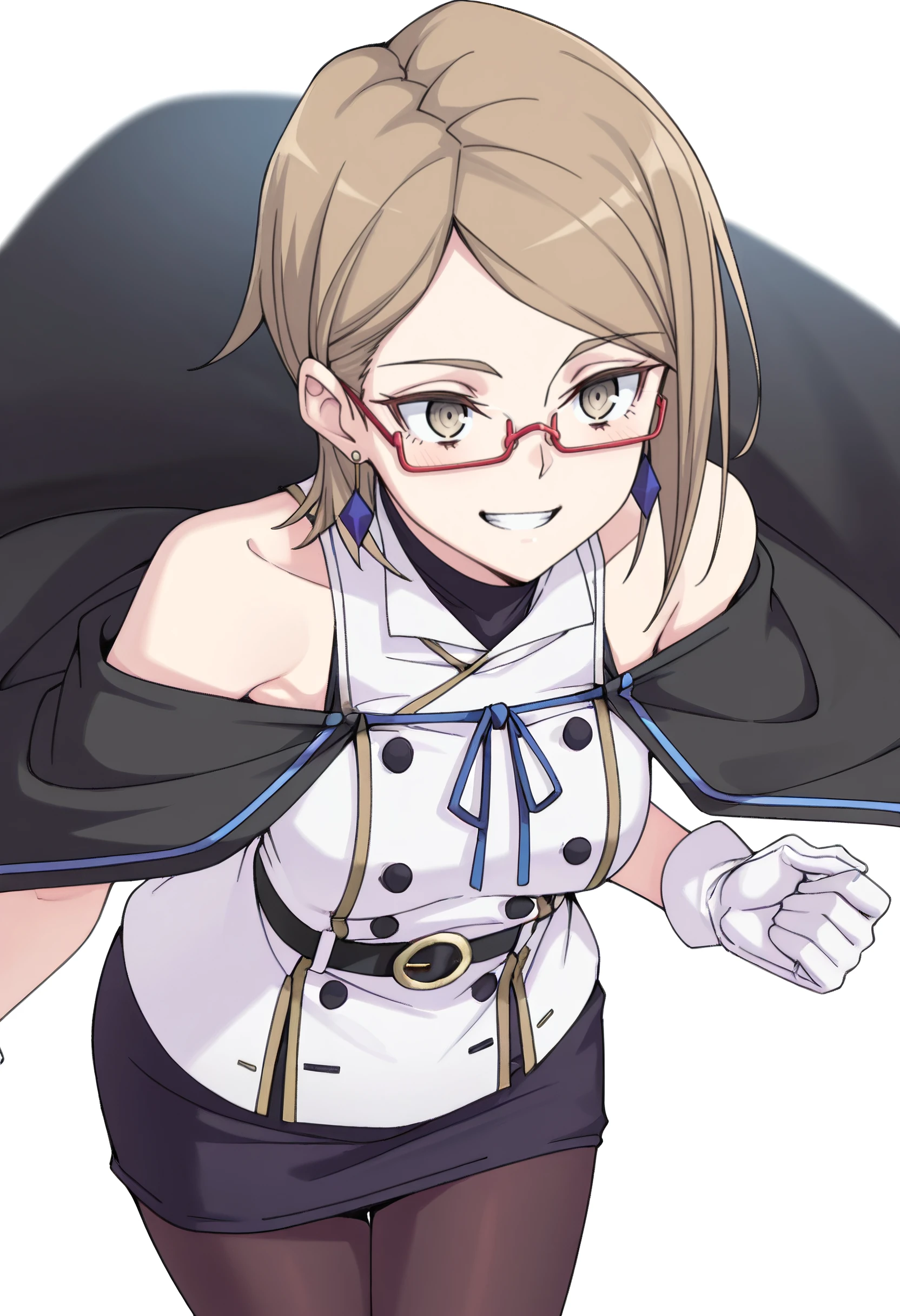 MirandaOutfit, jewelry, earrings, bare shoulders, cape, sleeveless, black cape, buttons, belt, double-breasted, ribbon, gloves, white gloves, black belt, blue ribbon, shirt, pantyhose, skirt, white shirt, black pantyhose, black skirt, miniskirt, pencil skirt, off shoulder,
