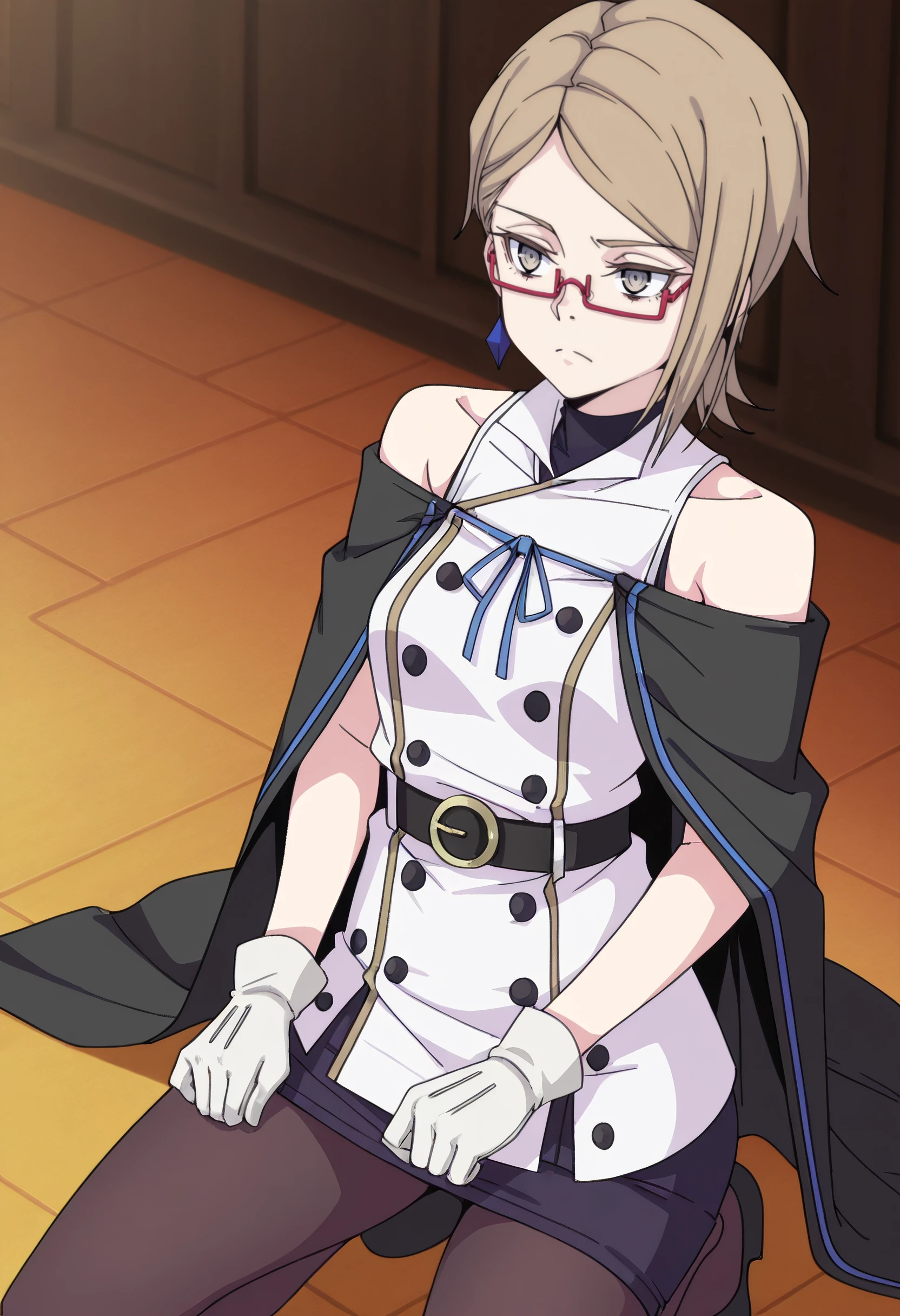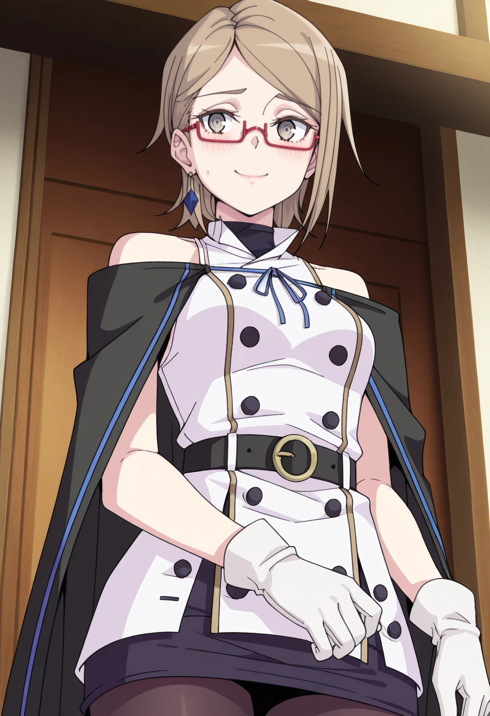 MirandaOutfit, jewelry, earrings, shoulders, cape, sleeveless, black cape, buttons, belt, double-breasted, ribbon, gloves, white gloves, black belt, blue ribbon, shirt, pantyhose, skirt, white shirt, black pantyhose, black skirt, miniskirt, pencil skirt, off shoulder,