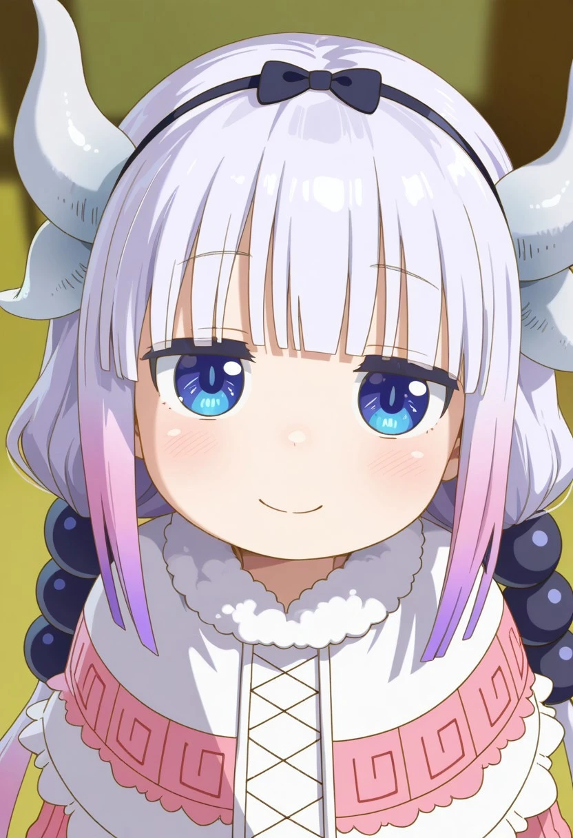 Kanna Kamui, dragon horns,white horns,very long hair,white hair,gradient hair,light purple hair,low twintails,hair beads,hair ornament,black hairband,hair bow,black bow,blunt bangs,blue eyes,