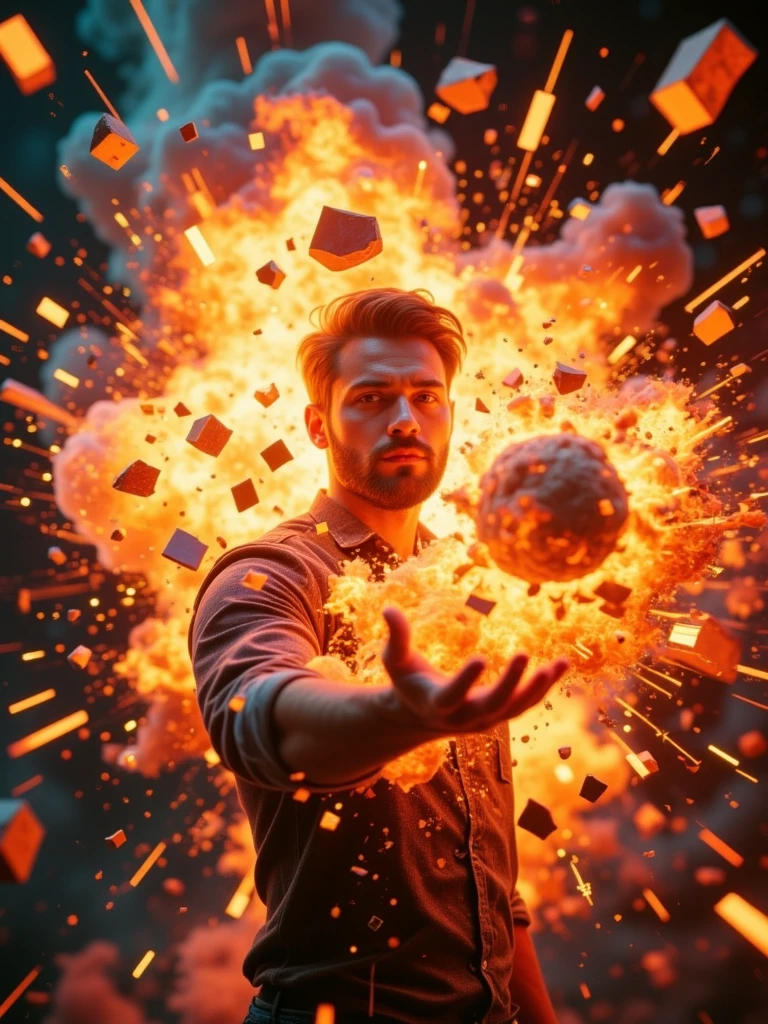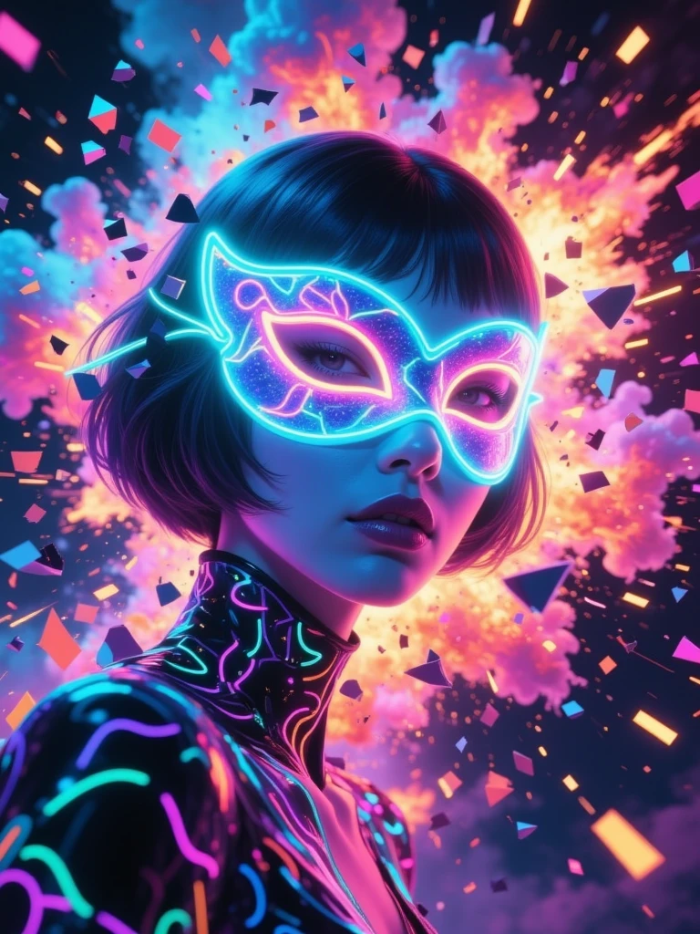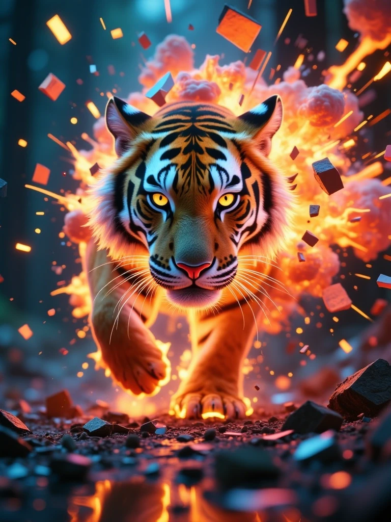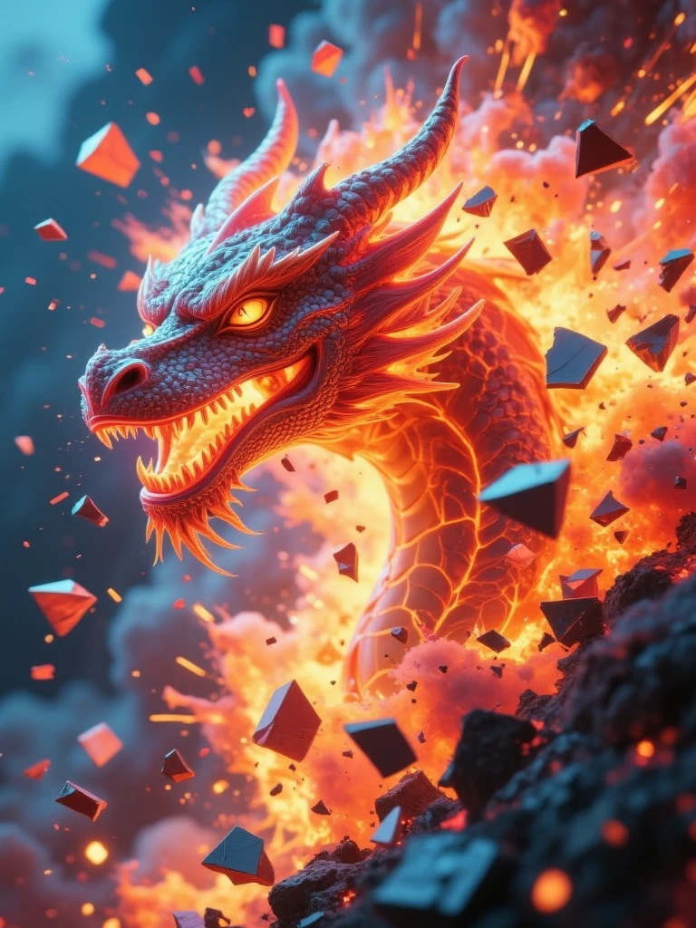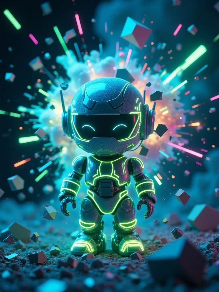 Glowing fragments,robot,photoshop (medium), robot, simple background, no humans, dark, glowing, solo, mecha, blue background, 3d, looking ahead, sfw