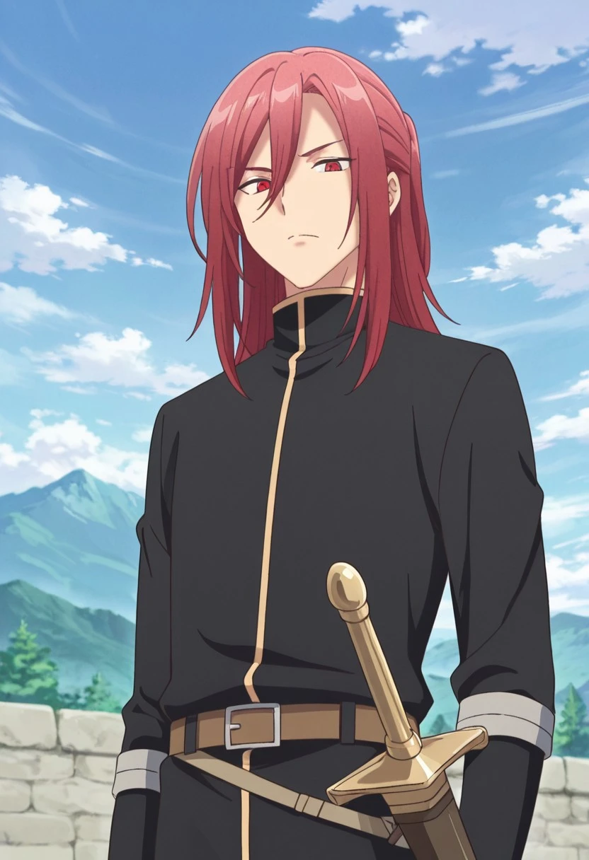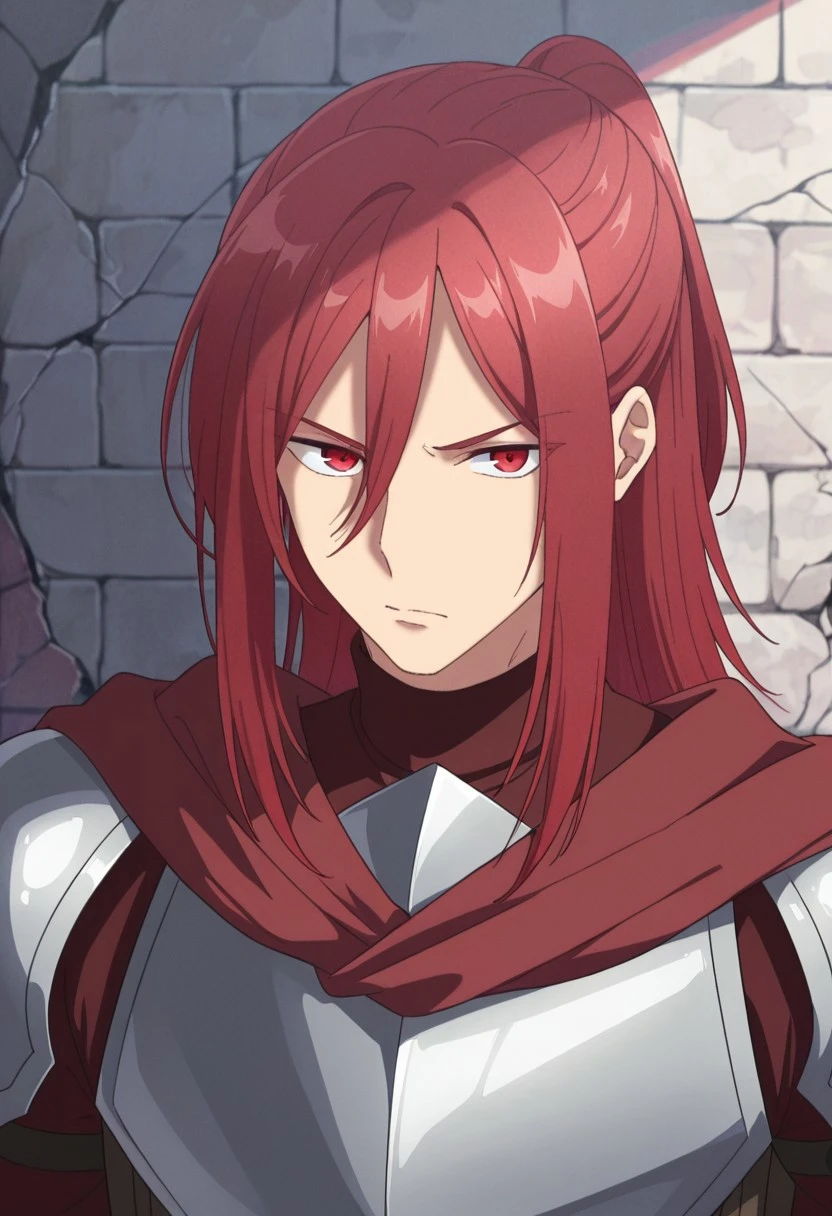 1boy, male focus, solo, red eyes, red hair, hair between eyes, long hair, ponytail, red shirt, turtleneck, red cape, armor, shoulder armor, breastplate, vambraces, brown gloves, belt, faulds, armored boots,
