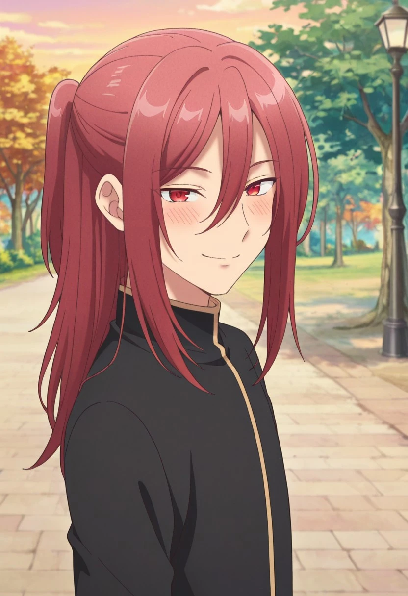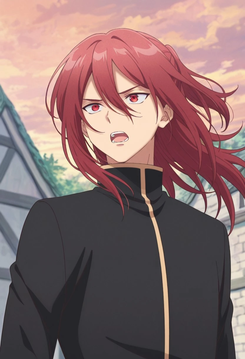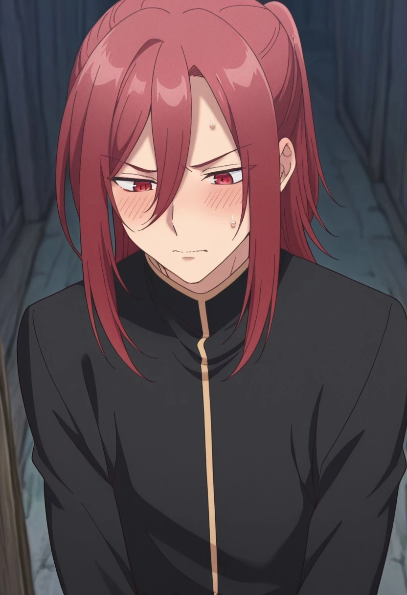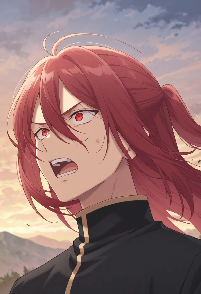 1boy, male focus, solo, red eyes, red hair, hair between eyes, long hair, ponytail, black robe, high collar, belt, brown pants, boots, black footwear,