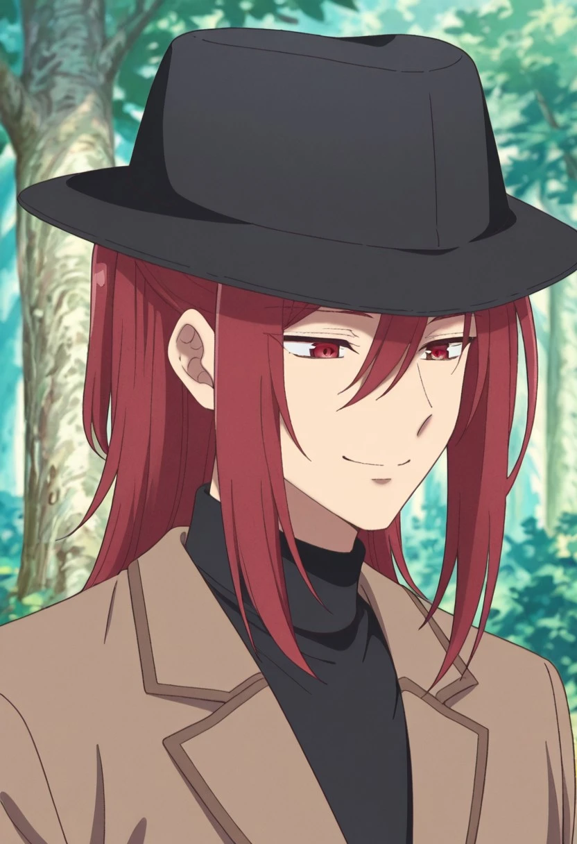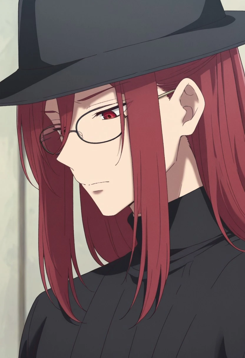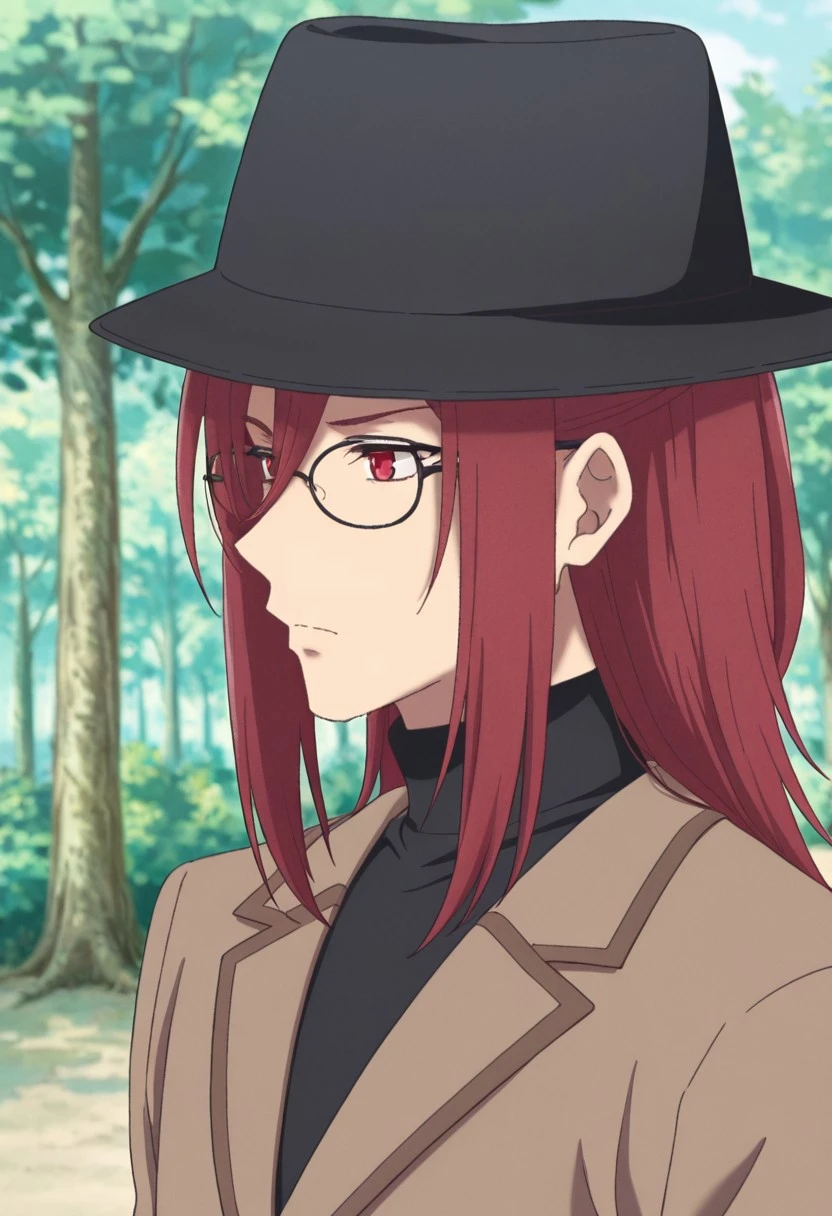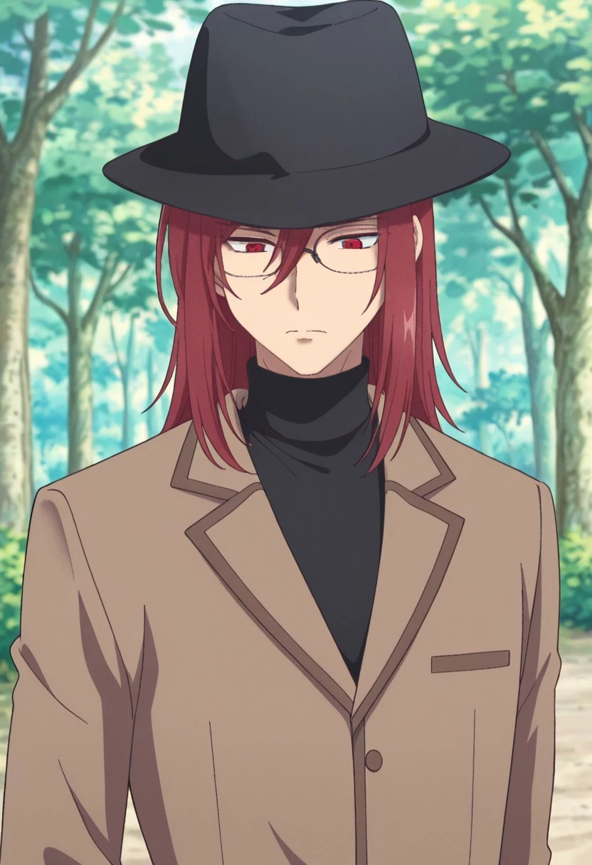 1boy, male focus, solo, red eyes, glasses, red hair, hair between eyes, long hair, ponytail, fedora, black headwear, black sweater, turtleneck, brown jacket, black pants,