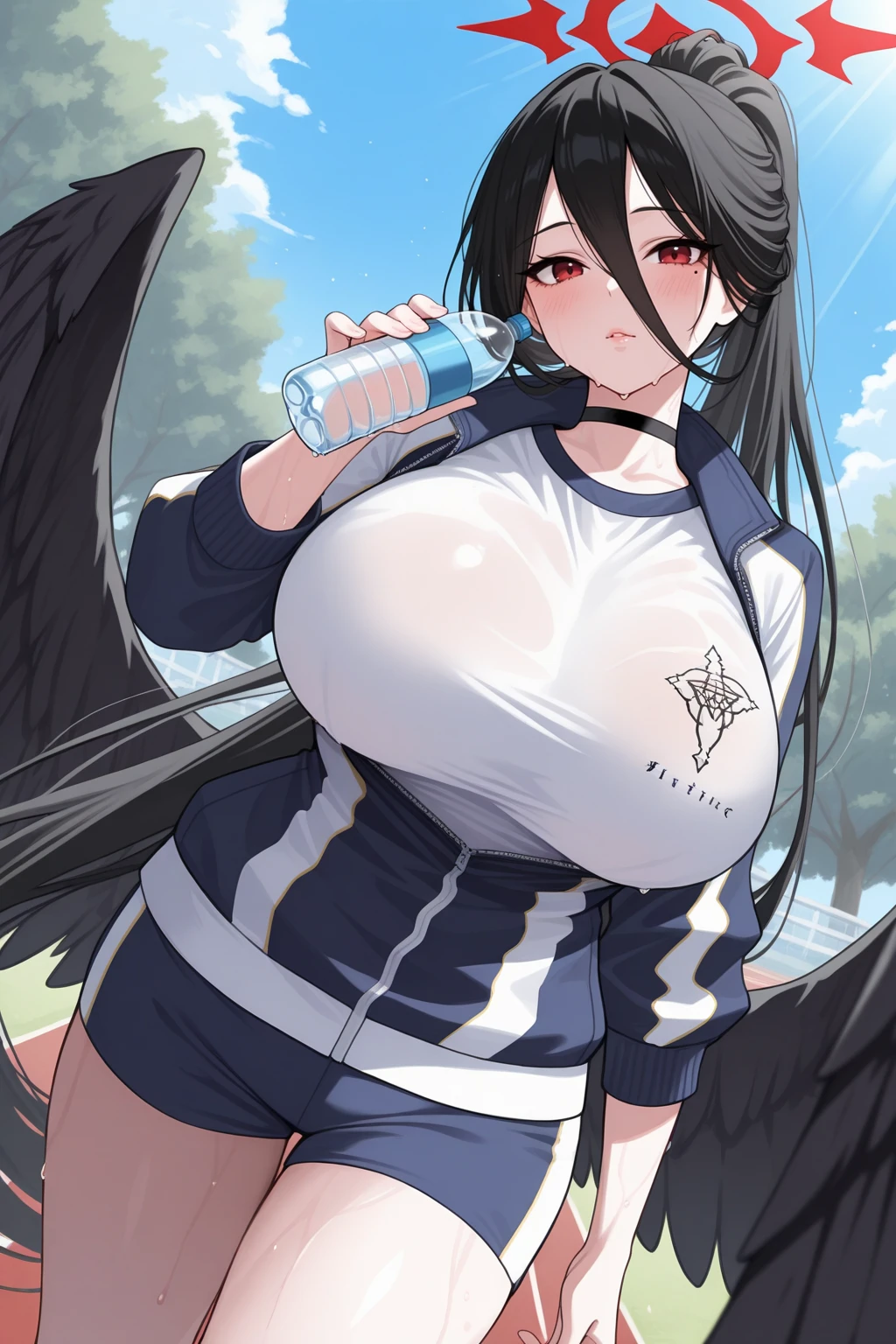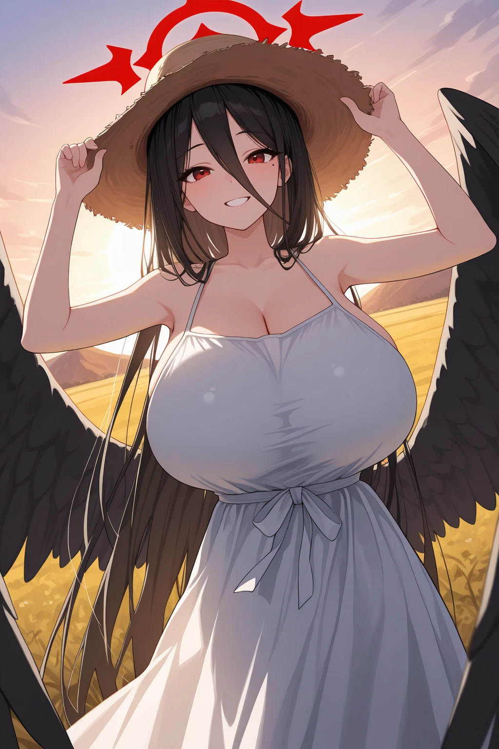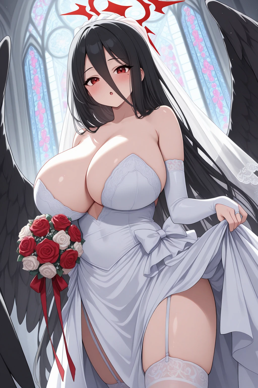 Appearance : hsmhnkw, huge breasts, mole under eye, red halo, low wings, large wings, black wings, red eyes, black hair, hair between eyes, very long hair