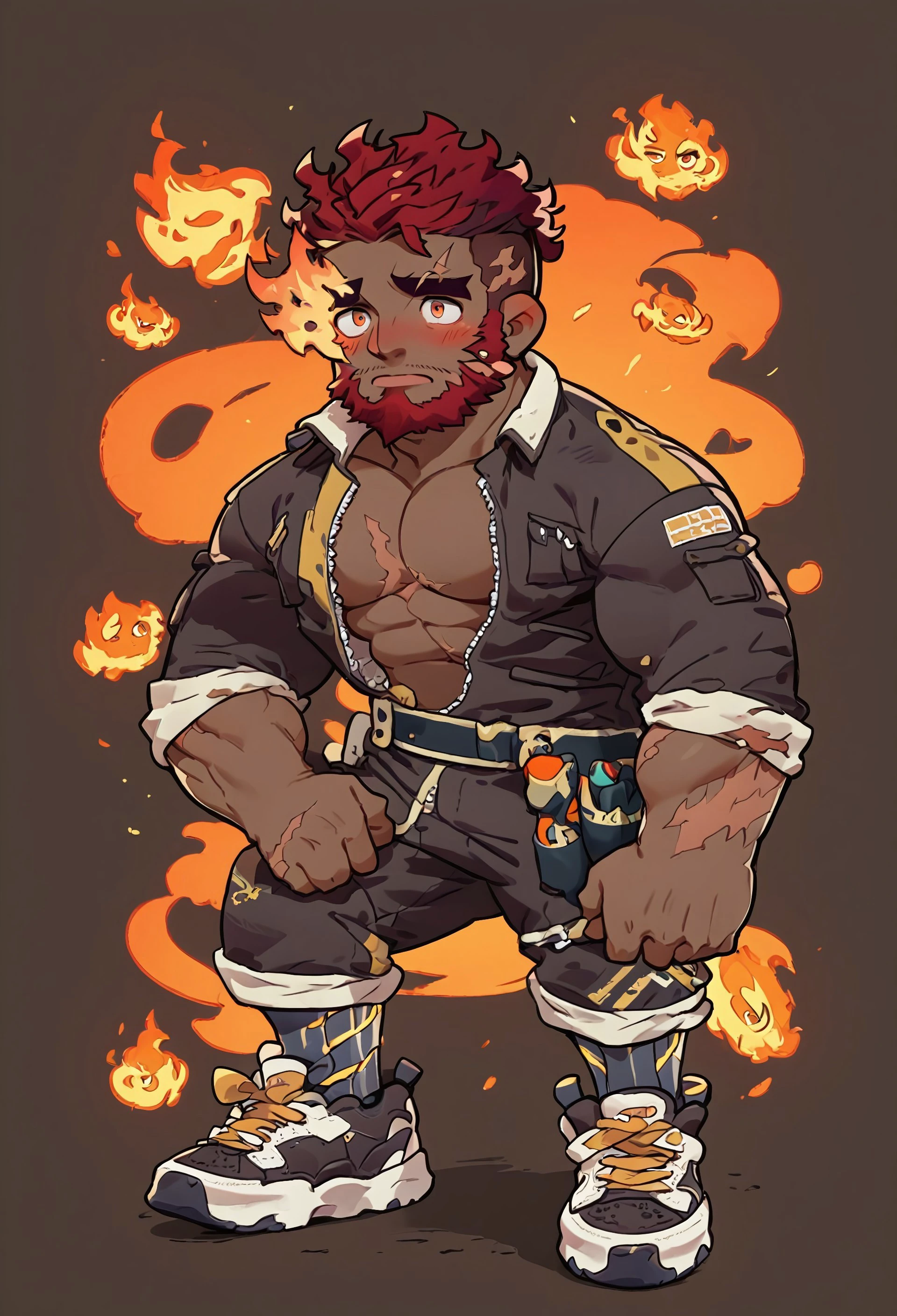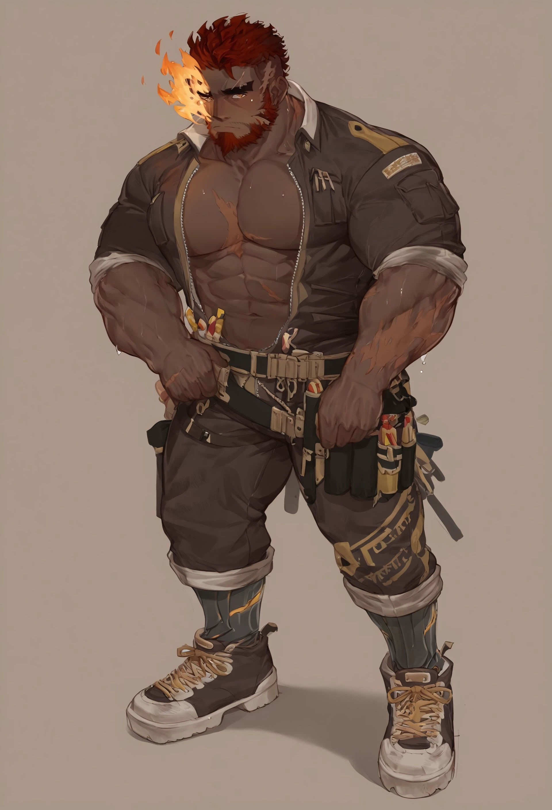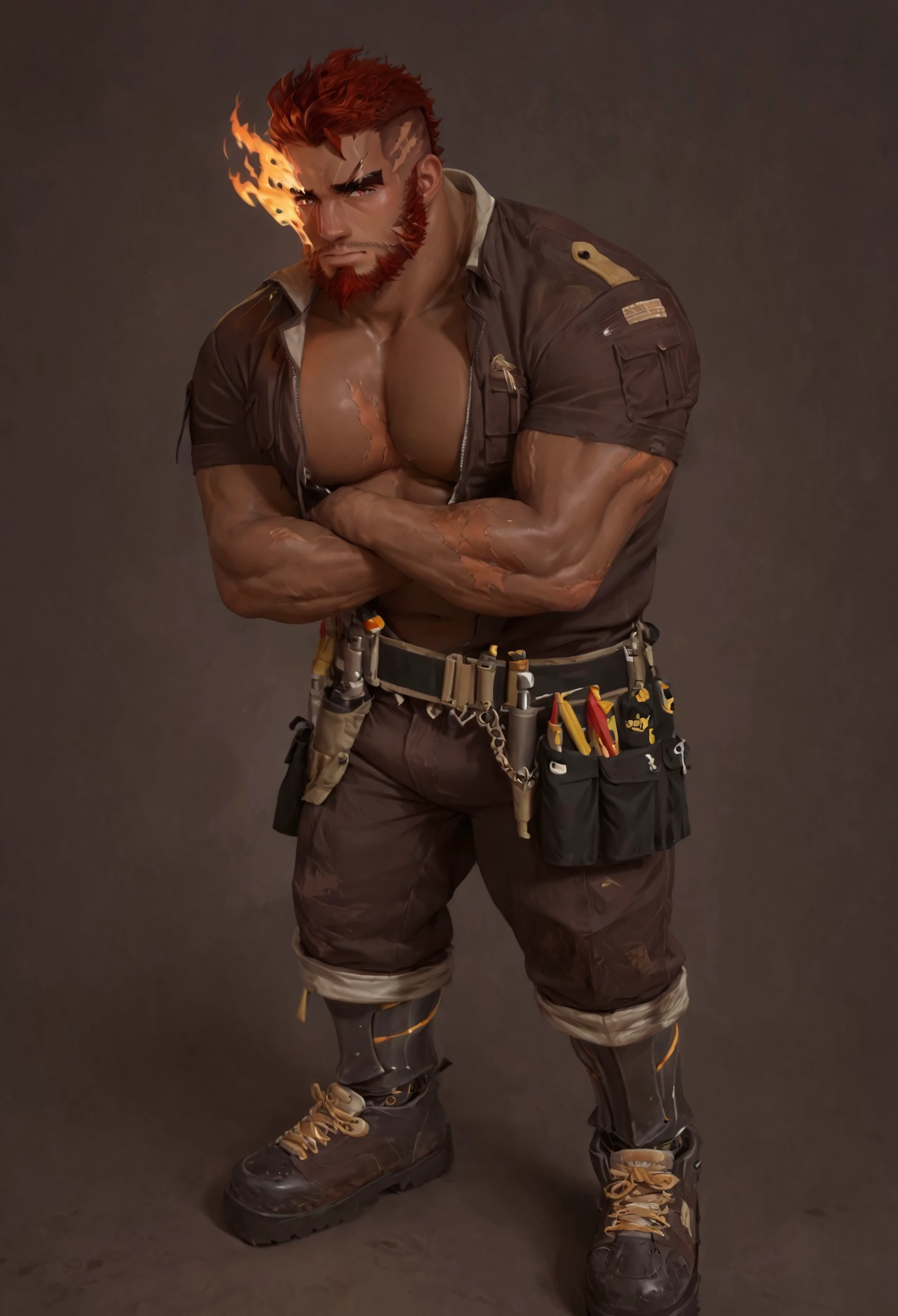 hephTAS, flaming eye, thick eyebrows, eyebrow cut, muscular male, muscular, mechanical legs, dark skin, dark-skinned male, facial hair, beard, scar, scars, body scars, scars all over, scar on face, scar on eyebrow, orange eyes, short hair, red hair, undercut,