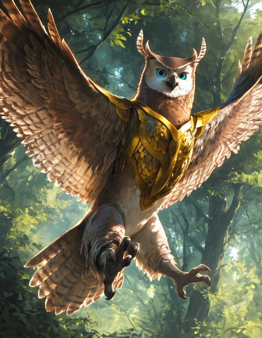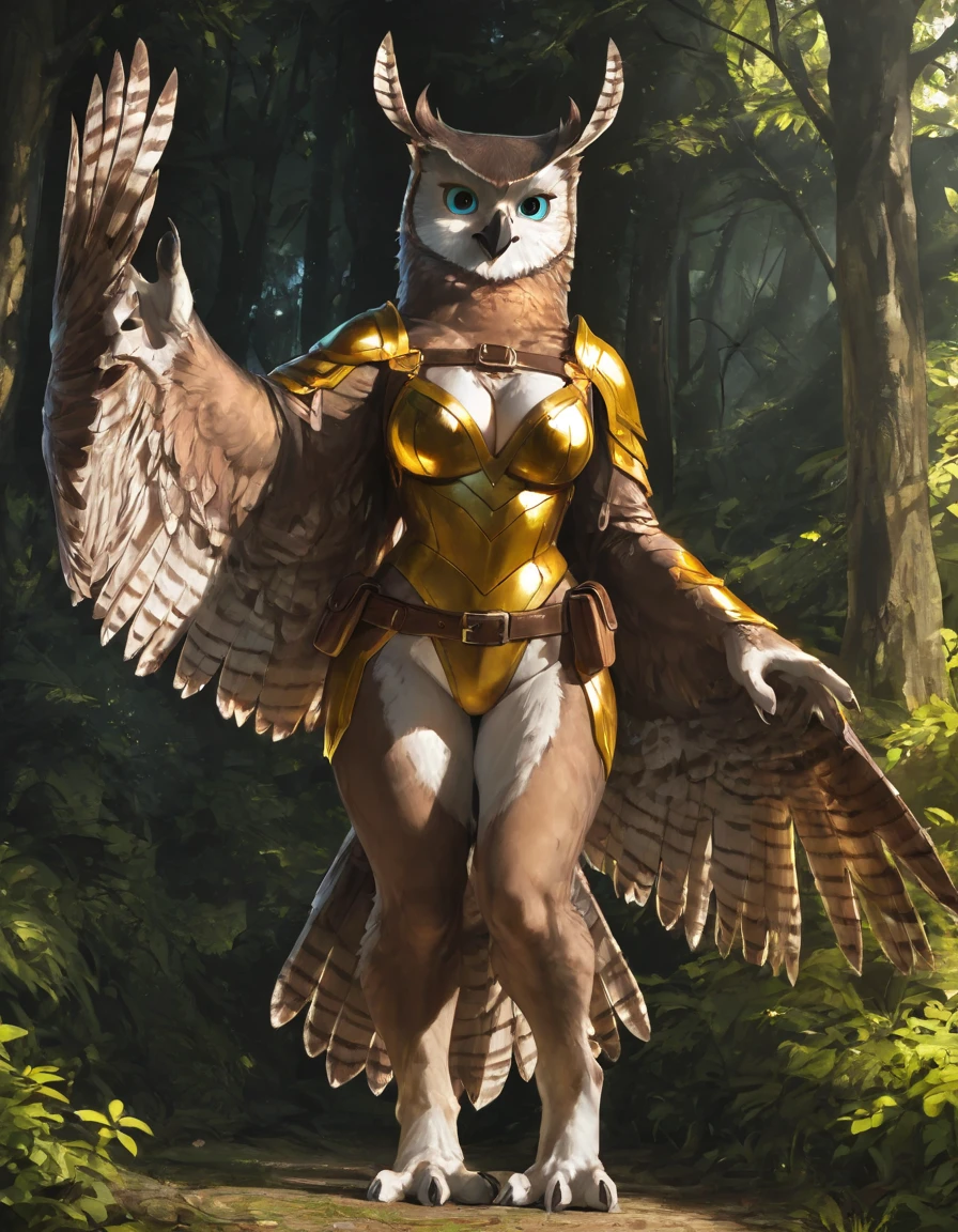 Longclaw, anthro, owl, female, two-tone feathers, brown-white feathers, blue eyes, two feathers behind the ears, chest harness, clevage, wide hips,