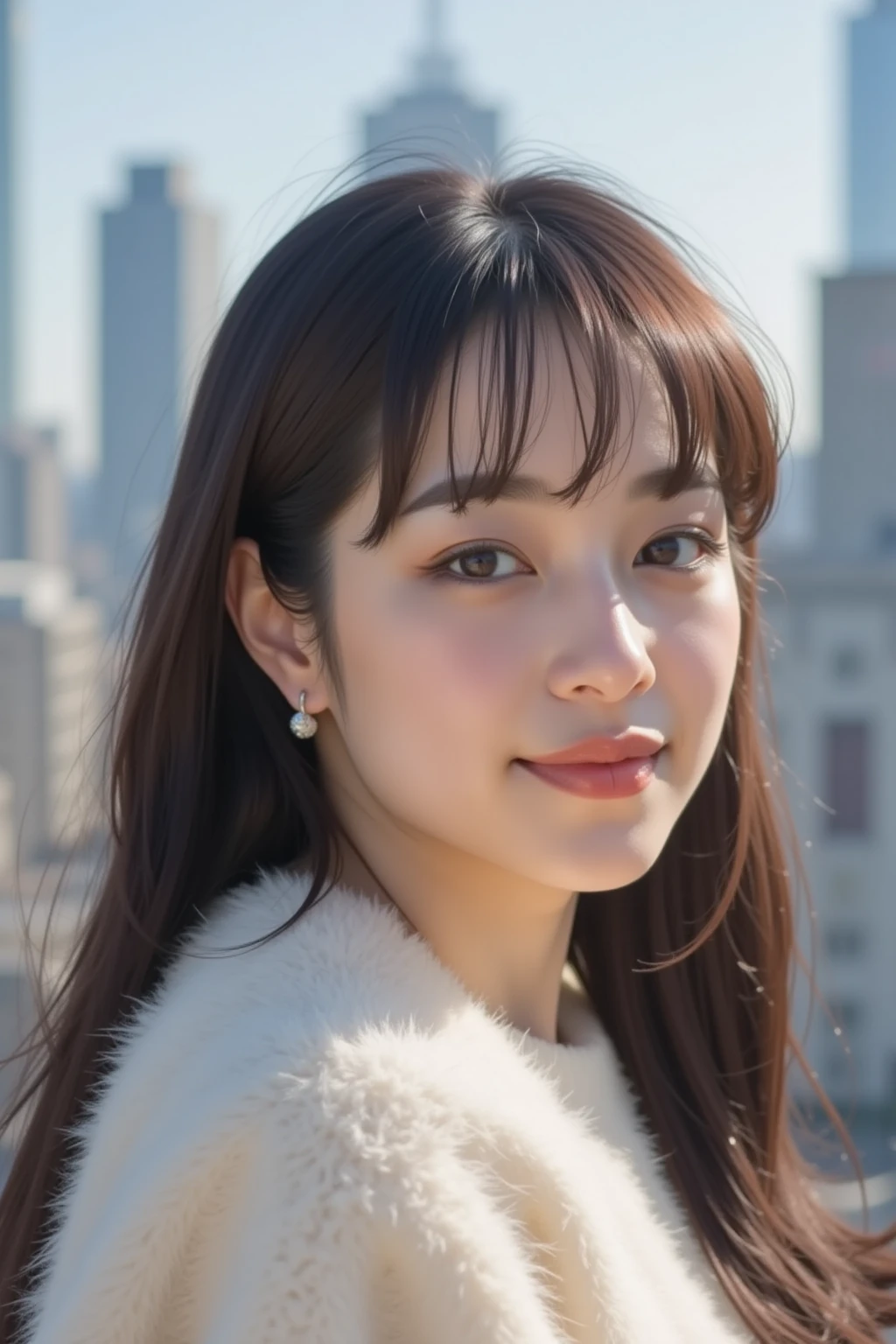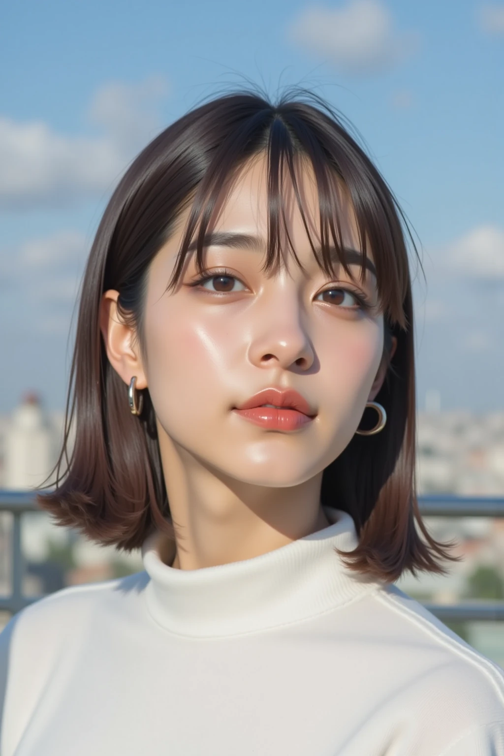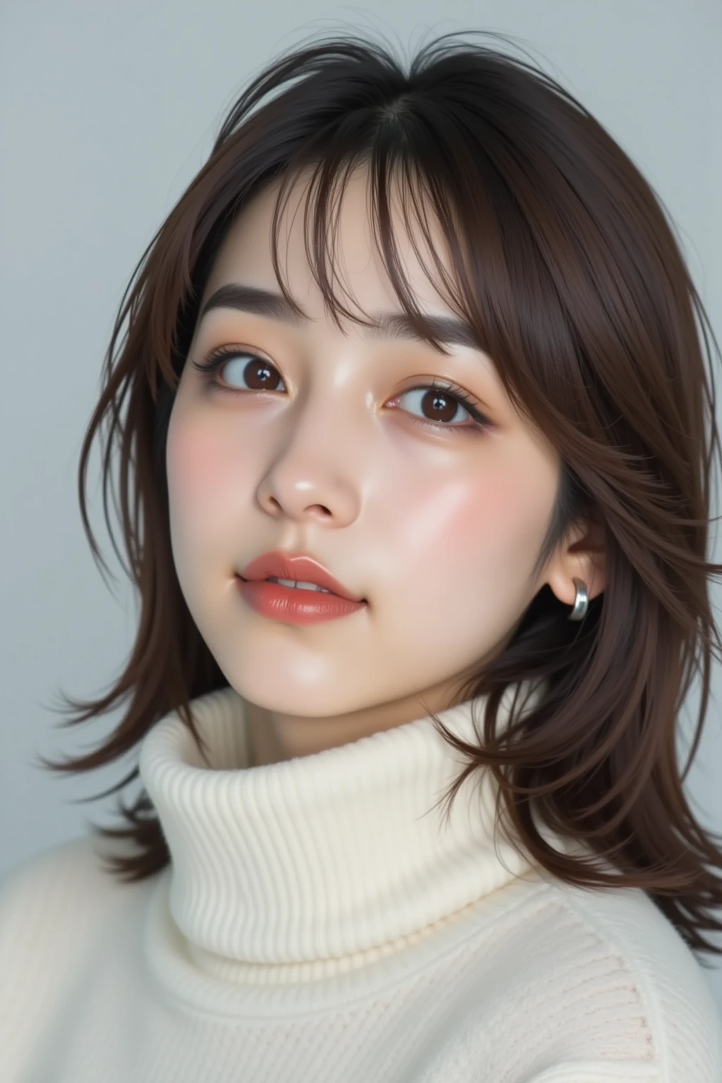 medium-length hair with ends curled outward, natural, smooth skin,
