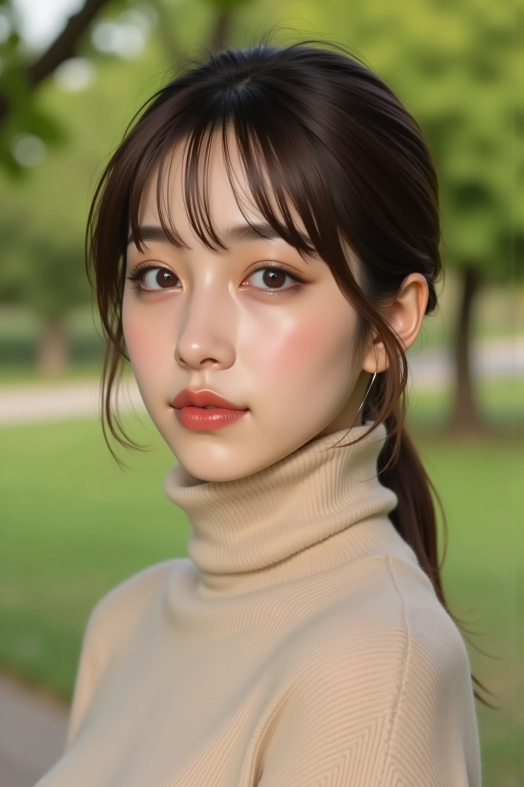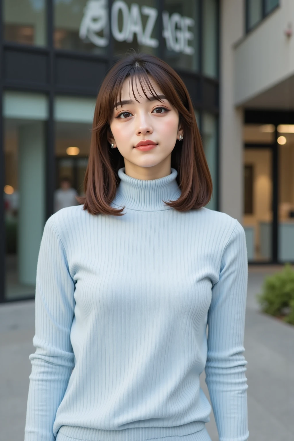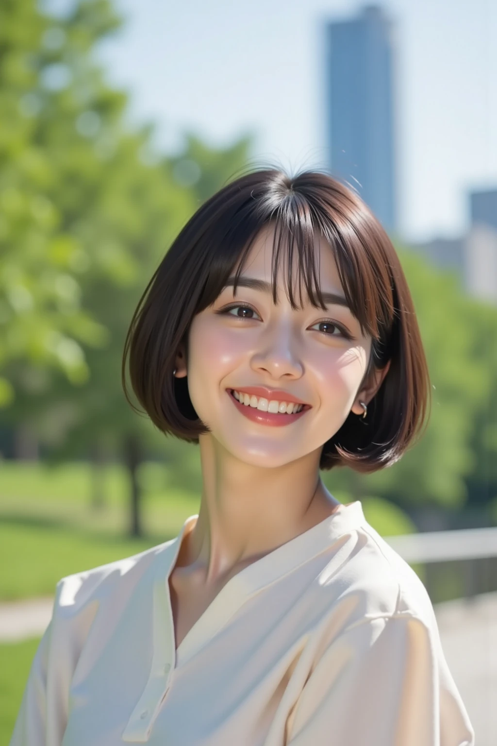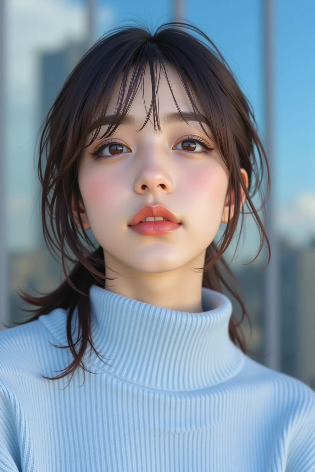 medium-length hair with ends curled outward, natural, smooth skin,