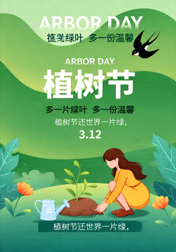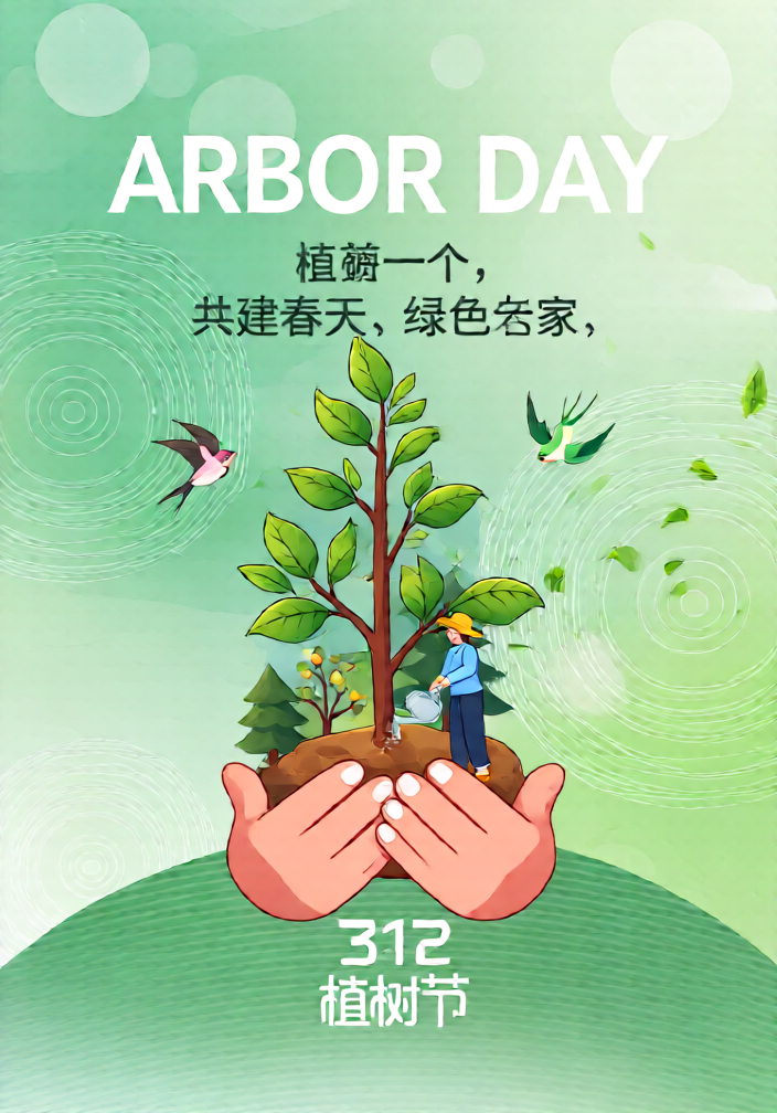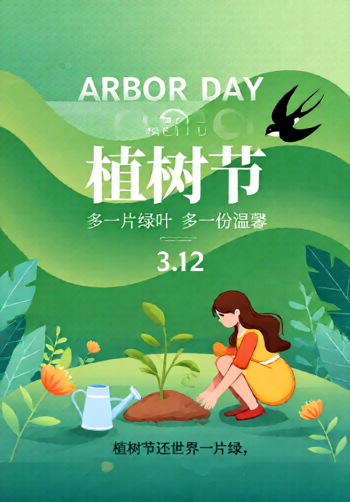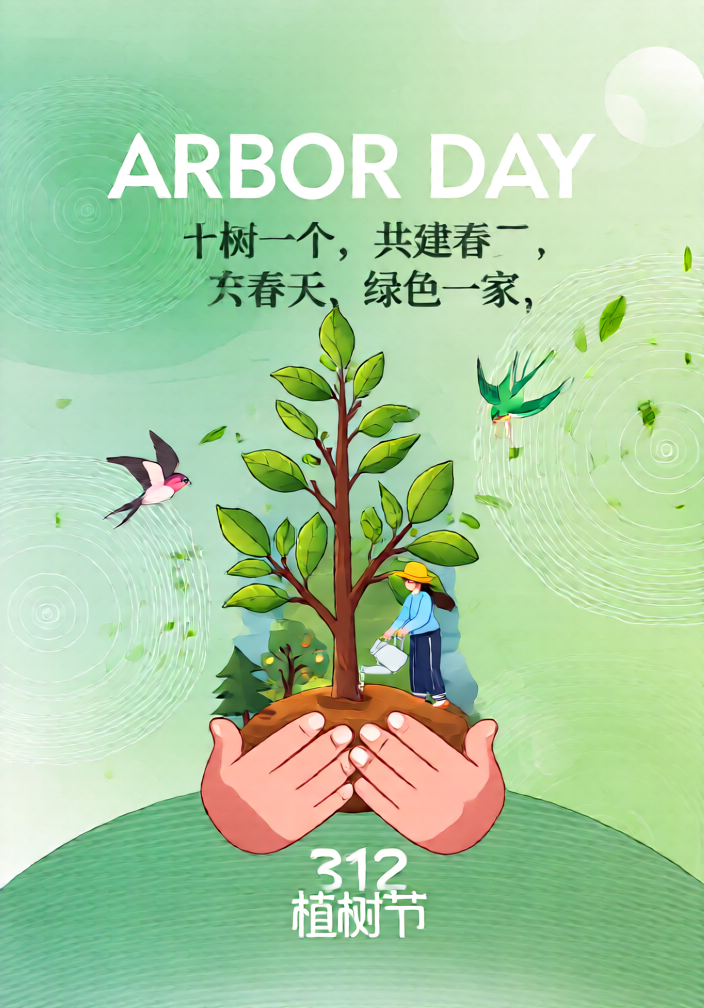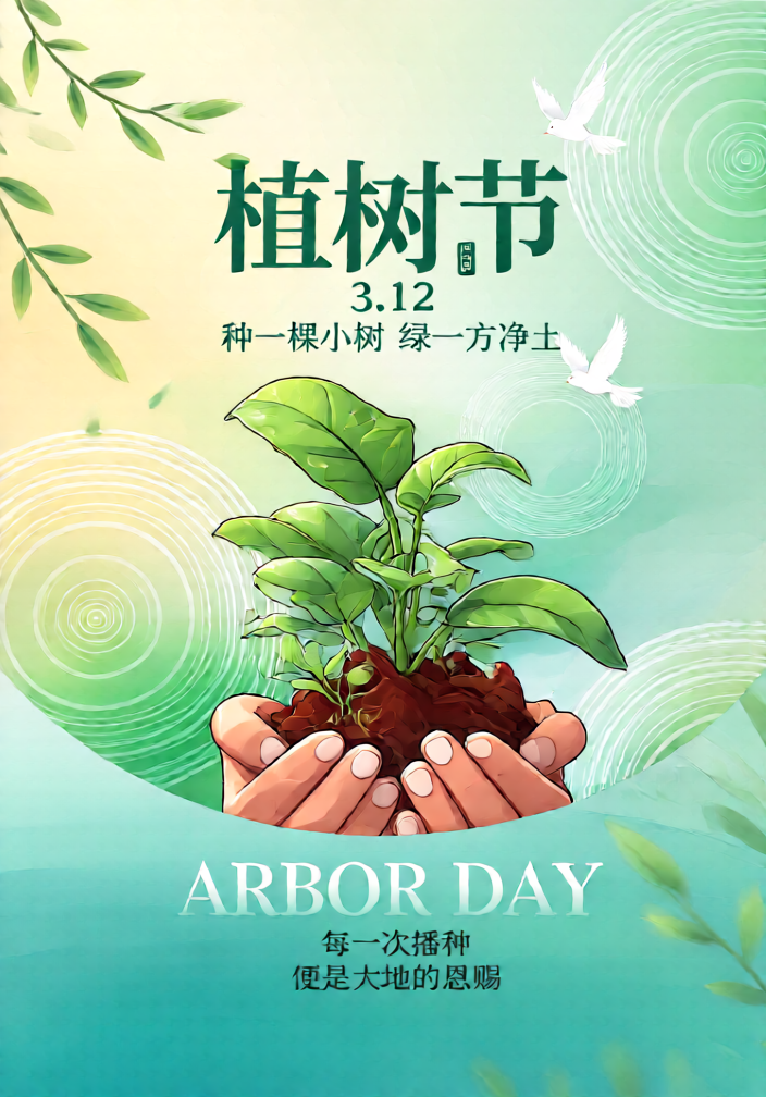 典型元素:土的新芽、参天大树(年轮细节)、双手托举树苗、飞鸟与蝴蝶(生态链)。铁锹与水壶(劳动工具)、绿色足迹(象征行动)、抽象化的“3·12”字样。手绘插画(温暖质感)、剪纸风格(传统韵味)、负空间创意(如用树叶拼成地球形状)。强调“行动号召”(如“种下一棵树,收获万点绿”)、“生态价值”(如“让森林呼吸更自由”)。