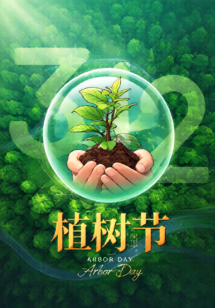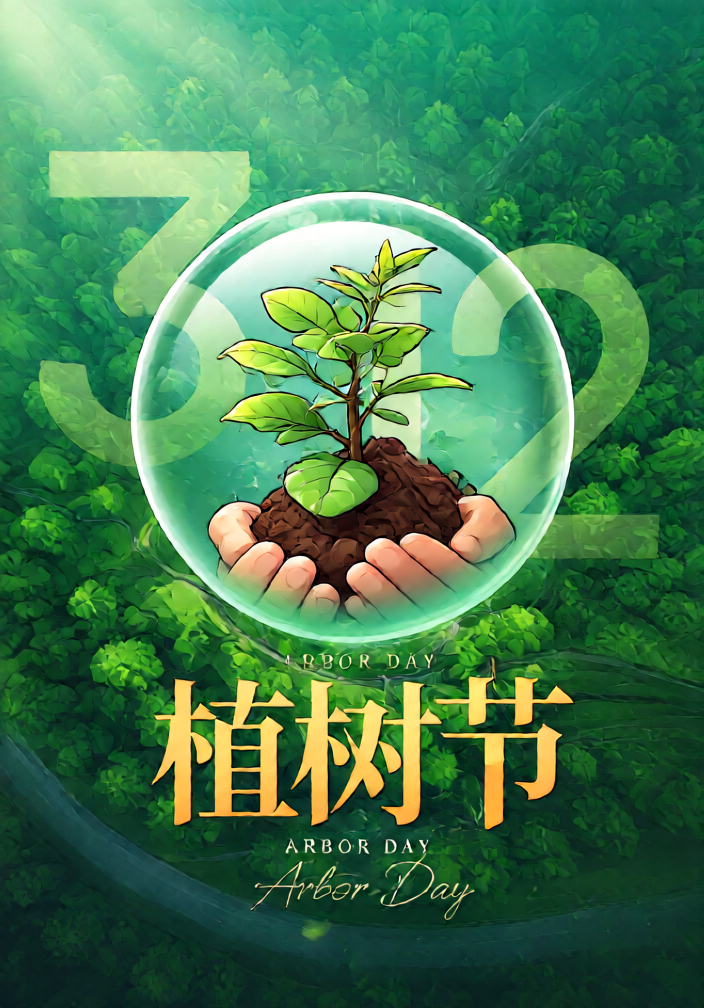 QwCNZhishujie, A pair of hands cradles a young sapling with vibrant green leaves and rich brown soil, enclosed within a transparent glass sphere. Behind it, an aerial view of a dense, lush forest stretches across the background in varying shades of green, with subtle light rays filtering from the upper left. Large, semi-transparent numerals “3” and “12” float faintly above the sphere. Below, bold golden Chinese characters read “植树节” (Tree Planting Day), accompanied by smaller English text “ARBOR DAY” and elegant cursive “Arbor Day.” The composition evokes care, growth, and environmental stewardship through its vivid greens, warm lighting, and symbolic framing.