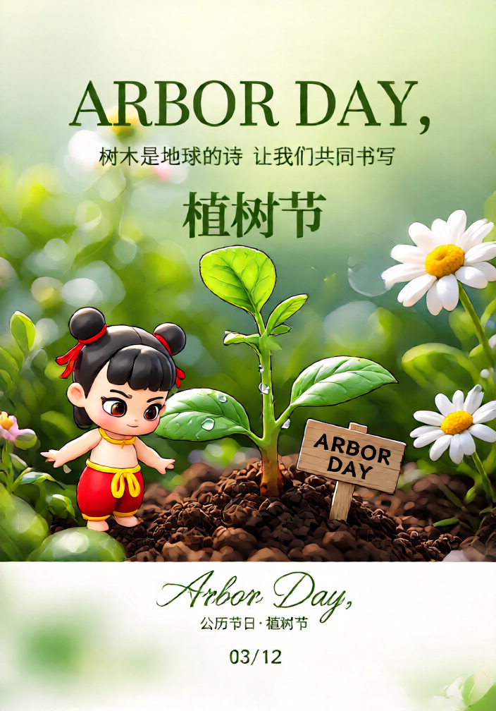 QwCNZhishujie, A cheerful cartoon child with black hair in twin buns, wearing a red outfit with yellow trim, stands beside a freshly planted sapling in rich brown soil. The sapling has green leaves and dewdrops on its stem, next to a wooden sign reading “ARBOR DAY.” Surrounding them are white daisies with yellow centers, soft pink blossoms, and lush green foliage under bright, diffused daylight. Above, large green text reads “ARBOR DAY, ” with smaller Chinese characters beneath stating “树木是地球的诗 让我们共同书写” and “植树节.” Below, elegant script repeats “Arbor Day, ” followed by “公历节日·植树节” and the date “03/12, ” all set against a gentle gradient background of pale green and cream.