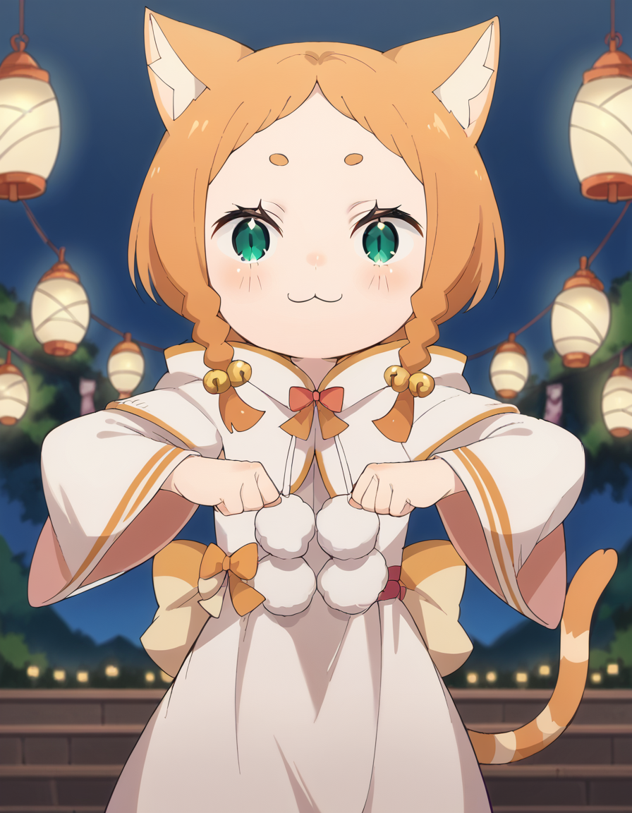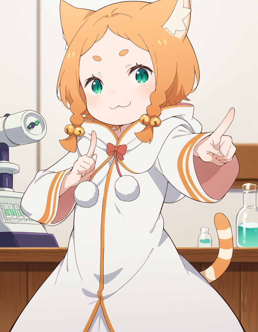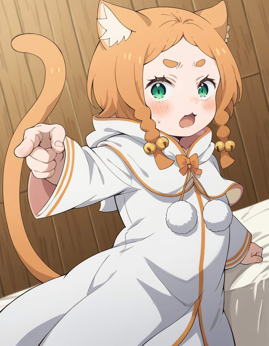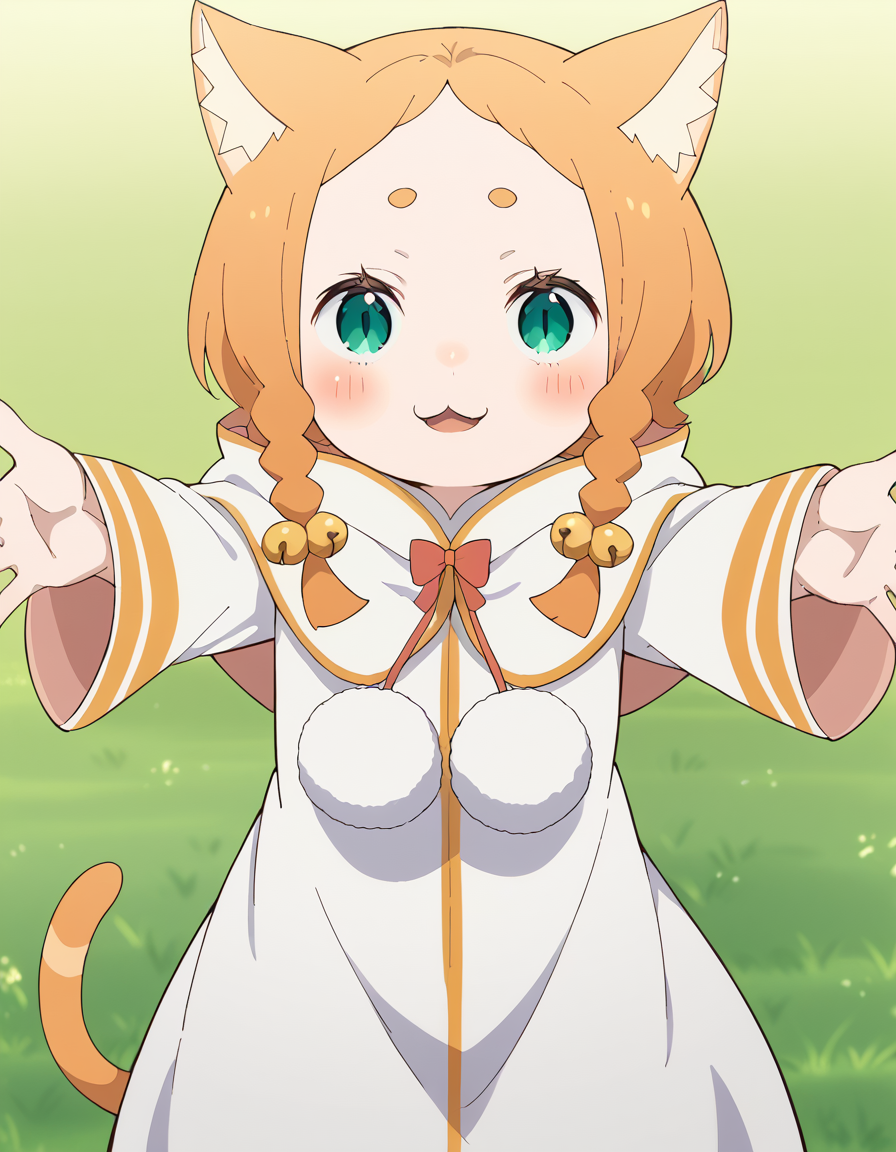 mimi, short hair, hair ornament, animal ears, green eyes, tail, braid, cat ears, orange hair, twin braids, cat tail, bell, cat girl, hair bell,
