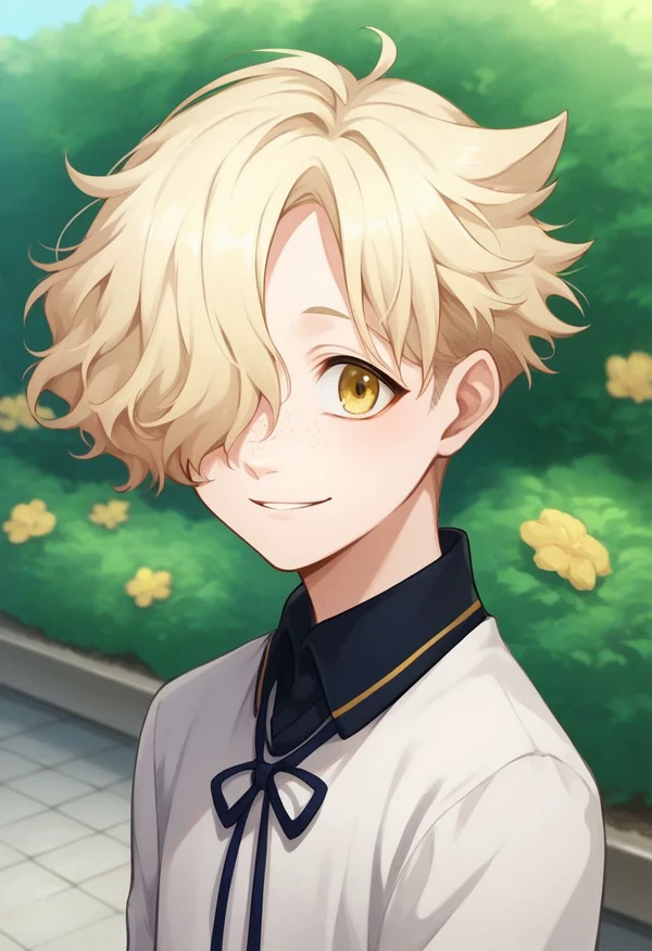 PROMPT gokotai, 1boy, male focus, hair over one eye, freckles, yellow eyes, blonde hair, pale, shirt, long sleeves, pants, shoes, ribbon, Made by - Redyaan https://civitai.com/models/523862/gokotai-touken-ranbu-commission
