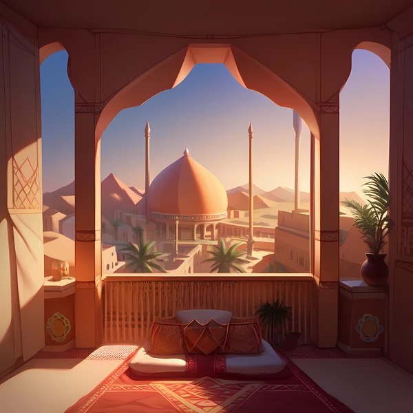 Creates an arabian styled background Strength of 0.7 Trigger: 4r4bi4n Optional: middle eastern architecture, desert, palm trees, arches, blue sky
