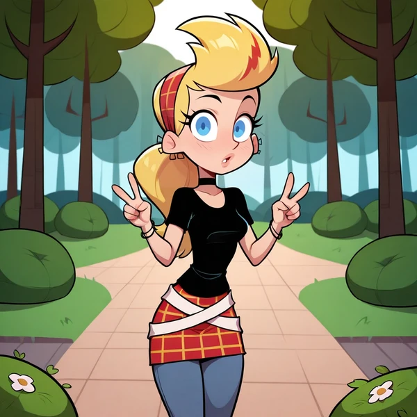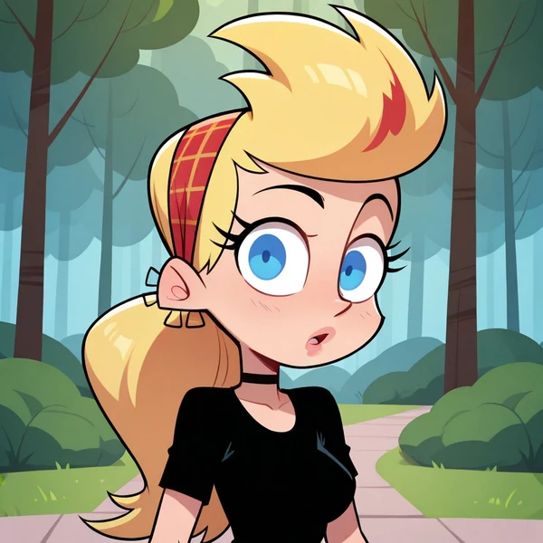 SissyBlakely, 1girl, solo, blue eyes, blonde hair, ponytail, hairband
